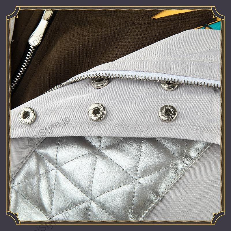 ▼ジャケットポリエステルギャバと合皮で製作しています。フード付きのジャケットで、両サイドに本物のポケットが施されています。胸先に電光のような柄が施されてかっこいいです。
