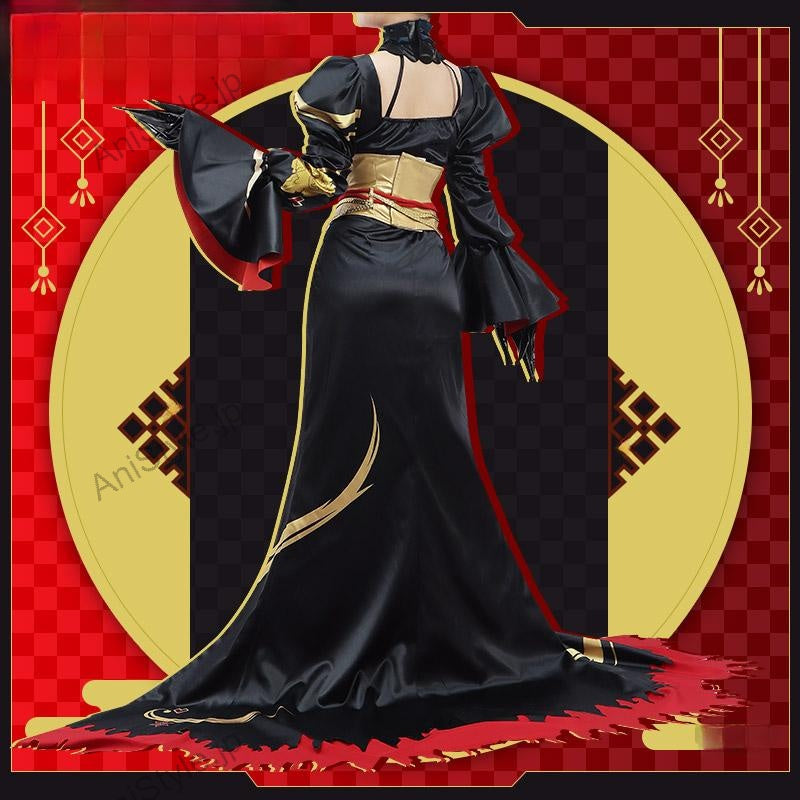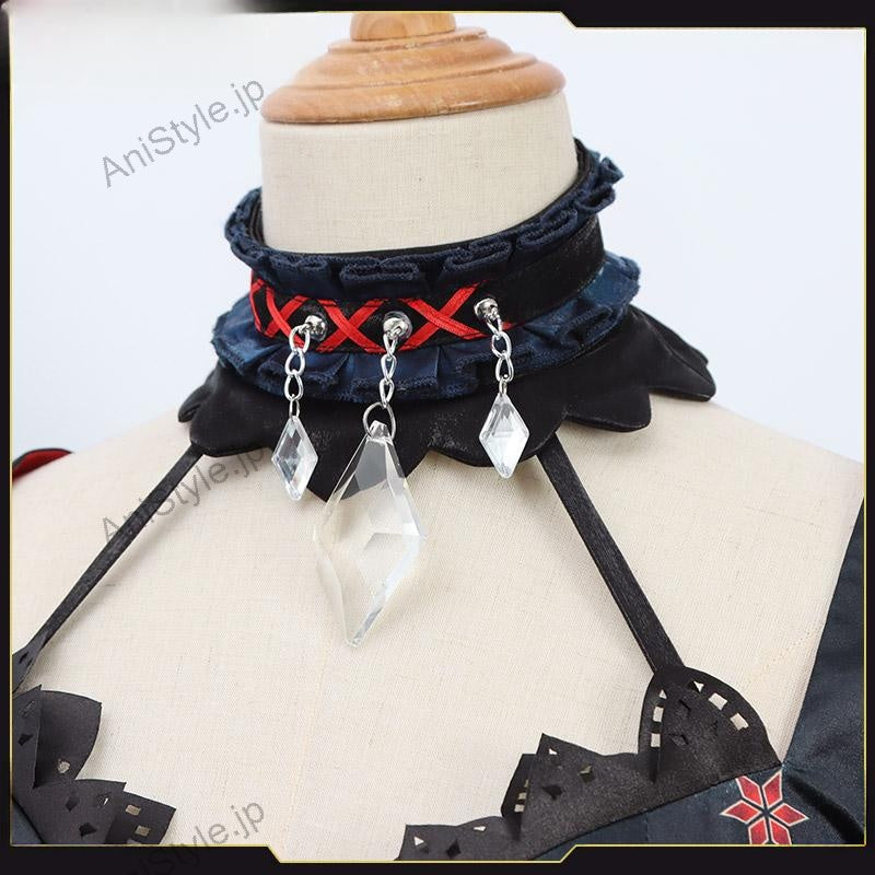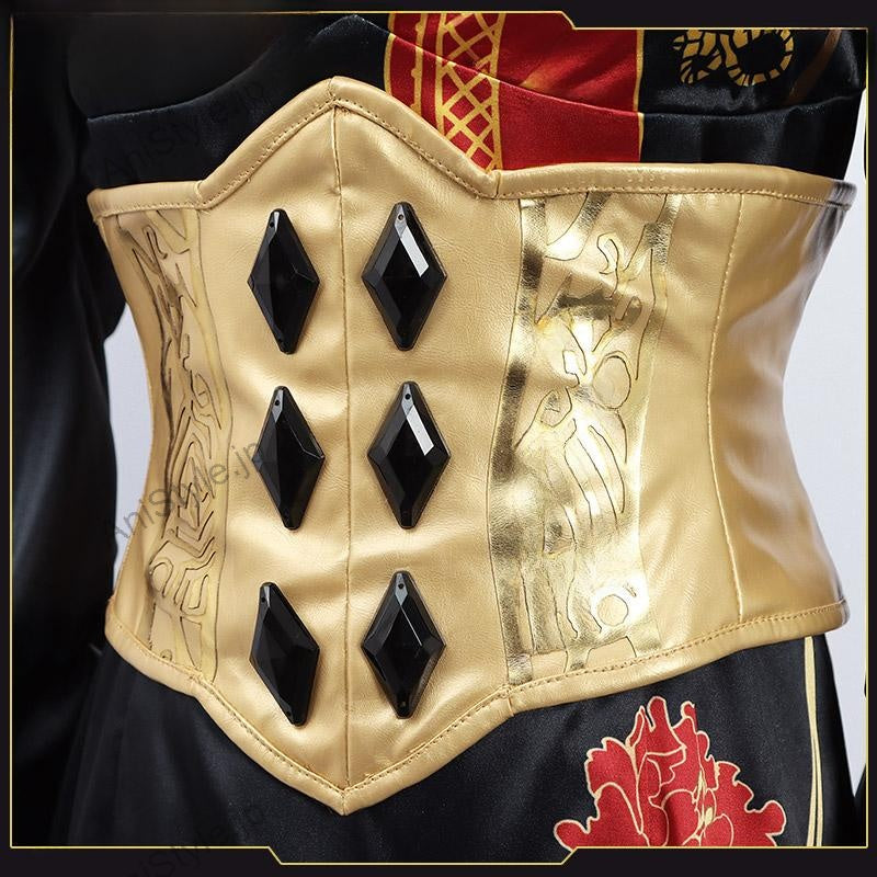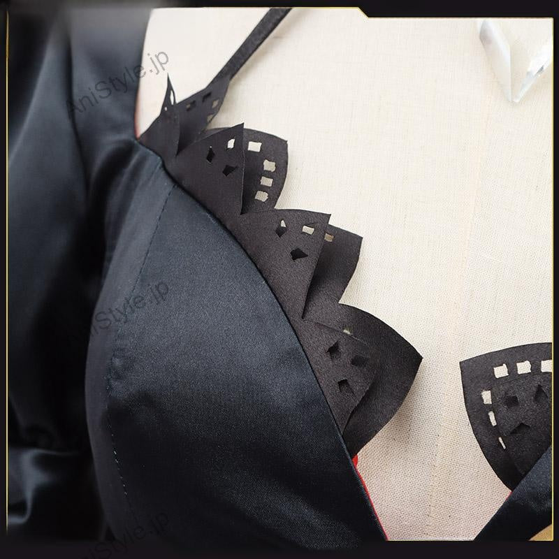 セット内容:計11点ワンピース、飾り物(カチューシャ、コルセット、紐2点、手袋2点、ハイソックス2点、靴下止め2点)■景品内容:計3点髪飾り、腕飾り、足飾り※数量限定のため、なくなり次第终了となります。■素材:サテン、合皮■商品詳細:▼ワンピースサテンで製作しています。黒と赤を基調として、スカート部分に牡丹の絵柄がプリントされて、華やかなワンピースです。炎のような形の裾があり、ユニークなデザインで印象的です。■備考欄:バーチャルYouTuber