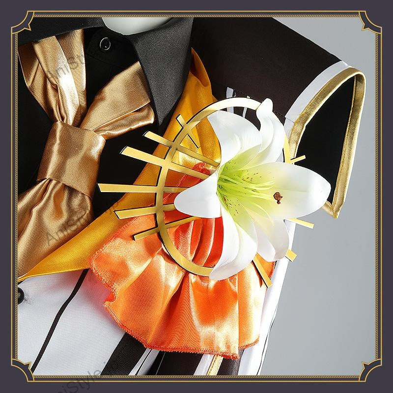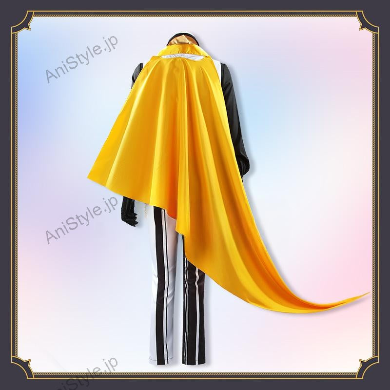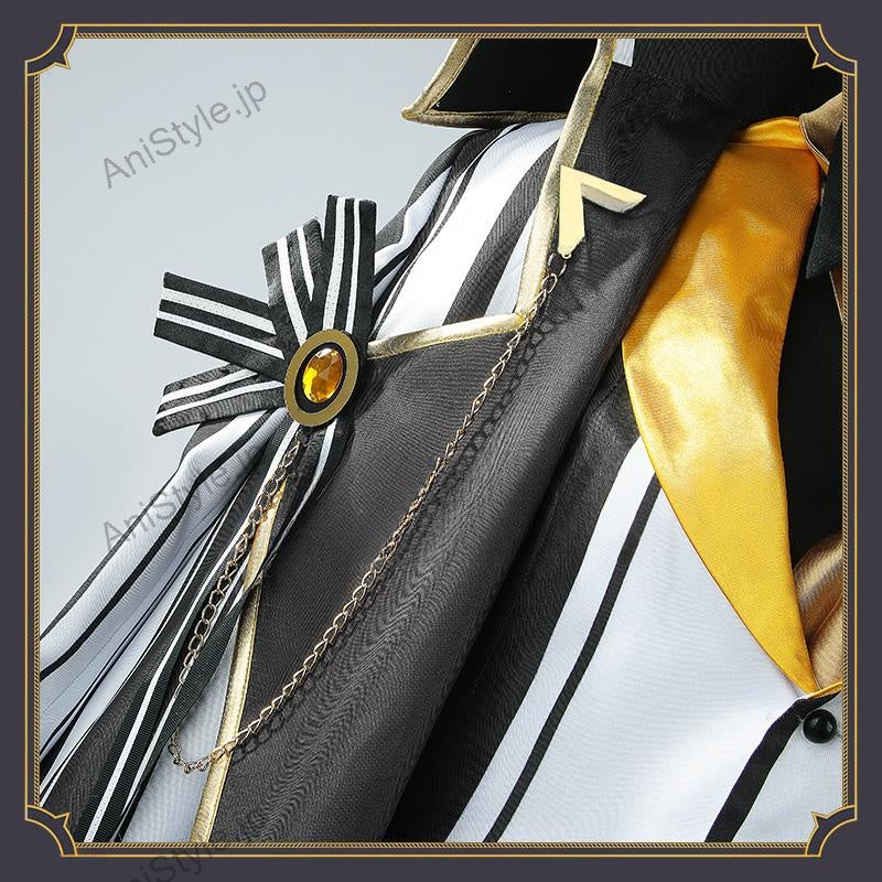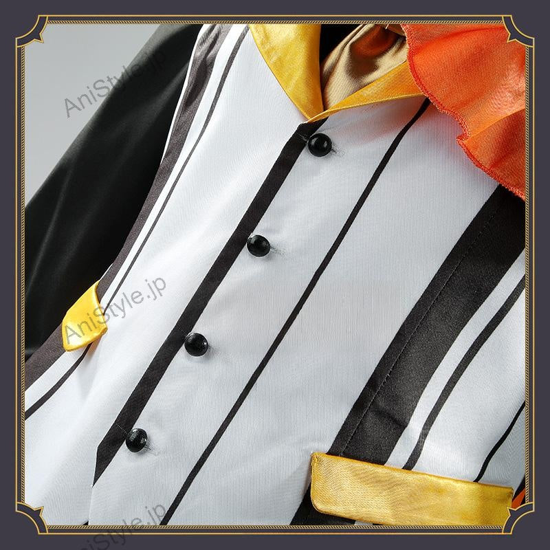 素材:ポリエステルギャバ、光沢布、サテン、合皮■商品詳細:▼マント主にポリエステルギャバで製作しています。黒と白を基調として、大きな立ち襟が印象的です。▼ベストポリエステルギャバで製作しています。白地に黒い縞のベストで、両サイドにフェイクポケットが施されています。ウェストのくびれたラインが綺麗に見えます。▼シャツシャツ生地で製作しています。無地のシャツで普段にも着られます。▼ズボンポリエステルギャバで製作しています。左右の裾の色が異なり個性的です。■備考欄:バーチャル
