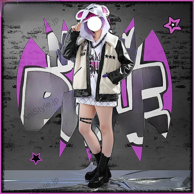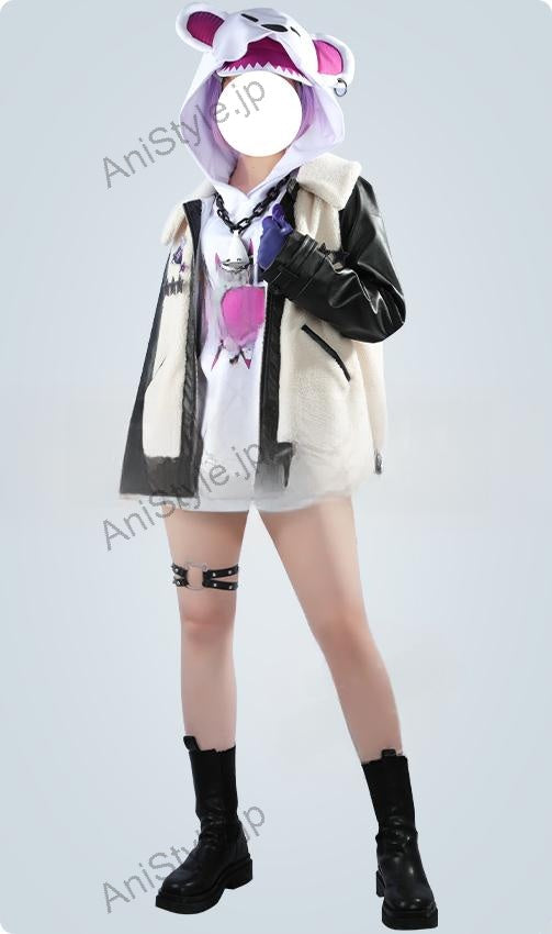 素材:ニット生地、フリース、レザー■商品詳細:▼ジャケットフリースとレザーで製作しています。胸に星の装飾が施されて、袖に黒を基調としてかっこいいです。▼パーカーニット生地で製作しています。白を基調として、帽子にクマの模様があります。原作に忠実な絵柄が綺麗にプリントされて再現度が高いです。■備考欄:バーチャルYouTuber