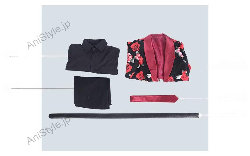 セット内容:計5点ジャケット、シャツ、パンツ、飾り物(ネクタイ、ベルト)■素材:ズック生地、ポリエステルツイル、シャツ生地■商品詳細:▼ジャケットズック生地で製作しました。タキシードカラーになっています。全身に赤いバラの模様が入っています。▼シャツシャツ生地で製作しました。スタンダードカラーになっています。黒を基調として、シンプルなシャツです。▼パンツポリエステルツイルで製作しました。シワにもなりにくく、長時間衣装を綺麗に維持する事ができます。▼飾り物ネクタイ、ベルトも付属しています。■備考欄:※こちらのヒプノシスマイク-Division
