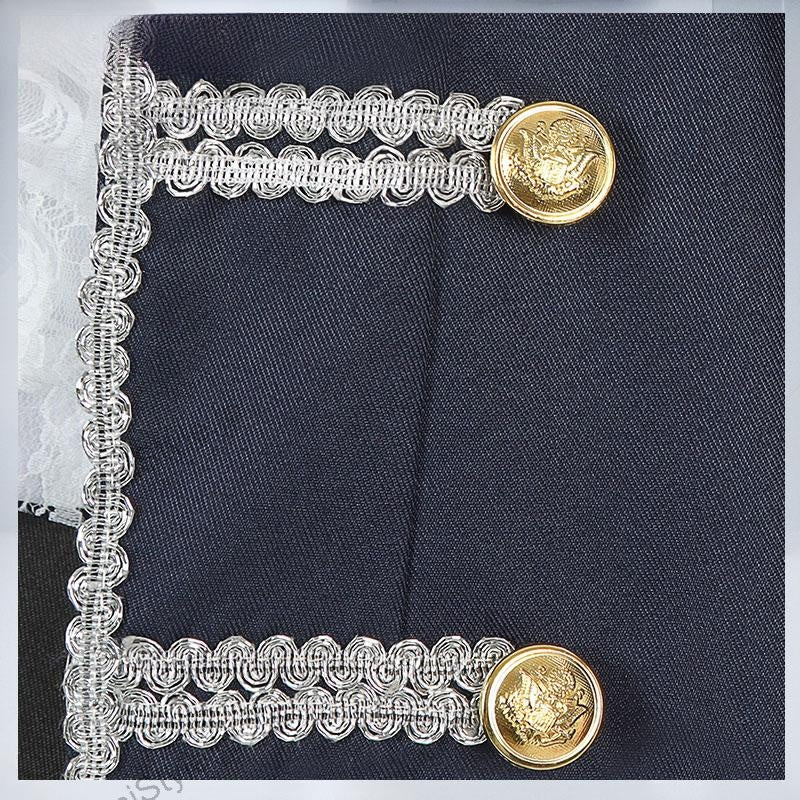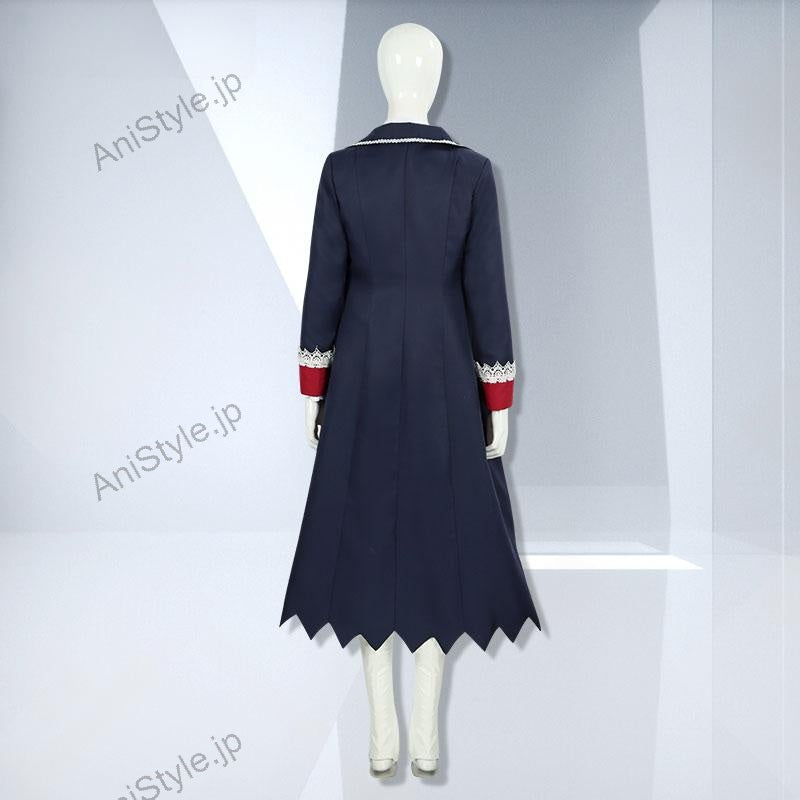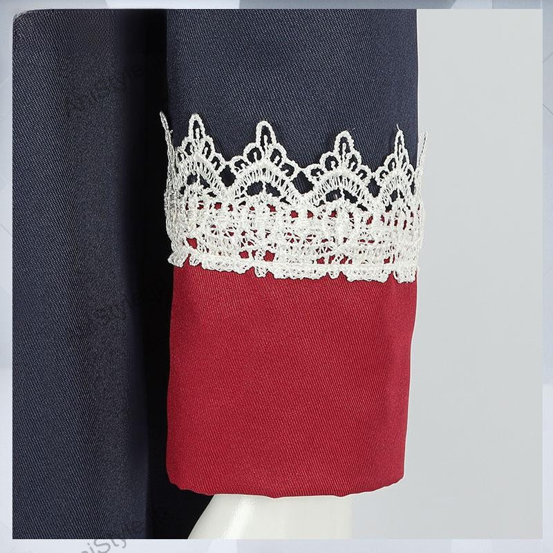 ▼コートポリエステルツイルで制作しています。ネイビーを基調として、赤い袖口に白いレースが飾っており、印象的です。ジグザグ形状の裾はポイントです。