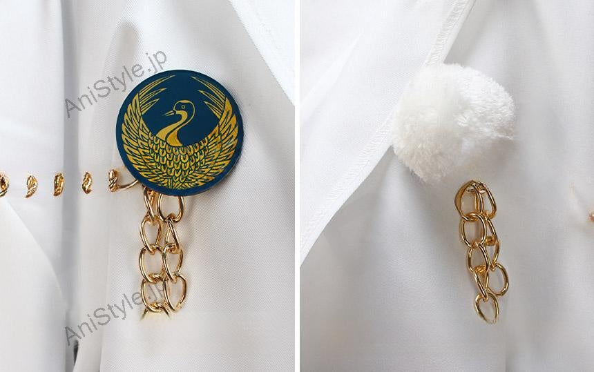 ▼羽織白を基調したポリ混紡生地にて製作します。肩の下に金色のチェーンとバッジが付き、格好いいイメージが溢れています。袖口は大きく、長めに制作されて、とても綺麗です。羽織には大きい帽子も付いて、元絵を完璧に再現しました。