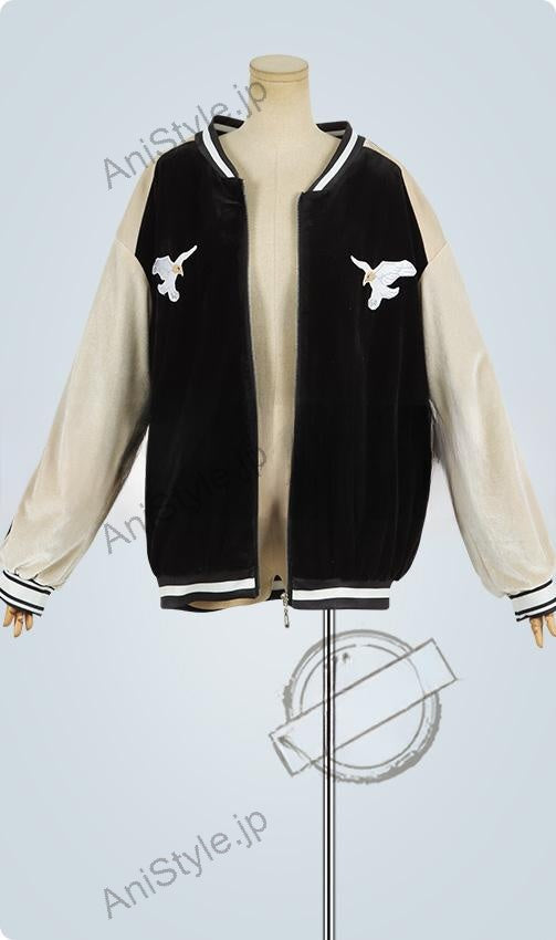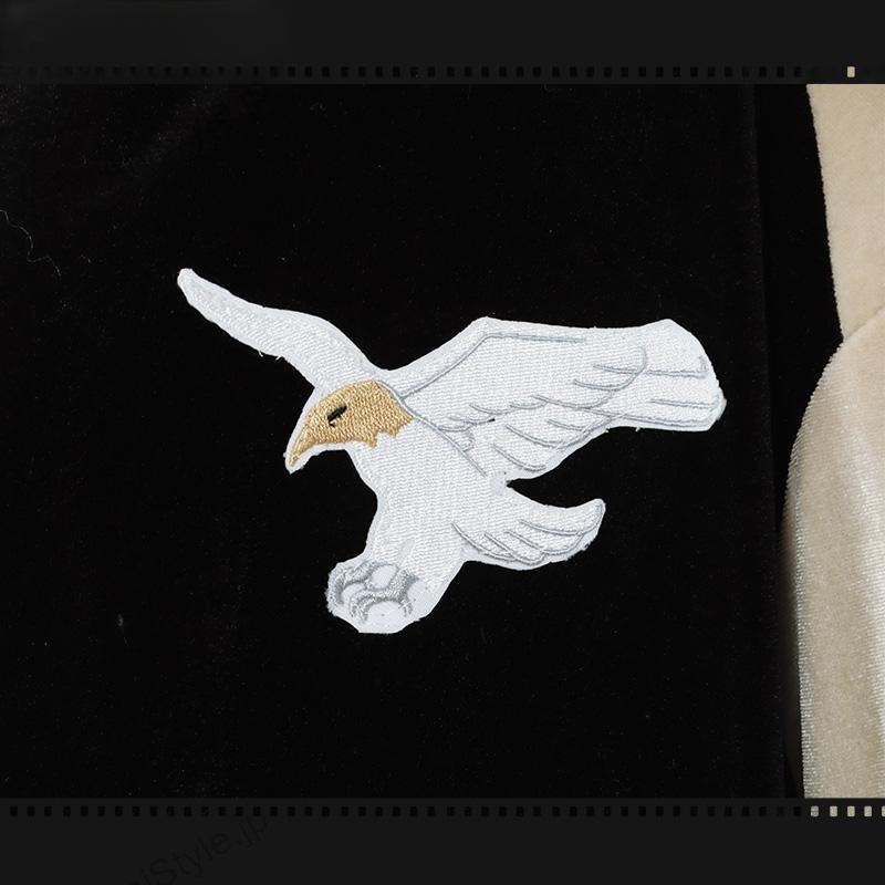 ▼ジャケット韓国絨で製作しています。胸元に2点の鷹の絵柄が縫い付けられた運動風のジャケットで、運動やすくて普段にも着られます。