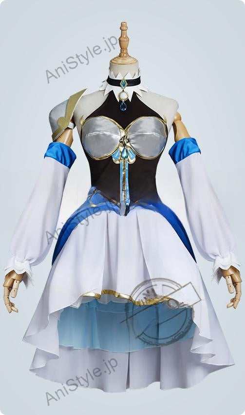 素材:シフォン、ソフトメッシュ、ポリエステル、ダンボールニット生地、合皮、ポリエステルツイル、サテン、PVC■商品詳細:▼上着ダンボールニット生地と合皮で製作しました。フロントに金色の縁取りされています。腰部に青い宝石がキラキラして綺麗です。▼スカートポリエステルで製作しました。いい素材を使ったので、着心地と換気性が良いです。▼飾り物飾り物(ニセジュエリー3点、リボン、髪飾り、肩当て、アームカバー2点、膝当て2点、パニエ)も付属しています。■備考欄:※こちらの白猫プロジェクト